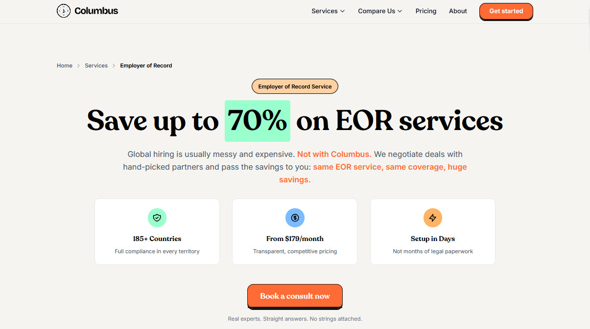 Columbus positions themselves explicitly as a cost aggregator, leveraging bulk purchasing power across their client base to negotiate preferential rates with underlying EOR providers. This model can work for commoditised services where quality varies minimally between providers. Employment compliance doesn’t fit this category particularly well because expertise, responsiveness, and judgement matter enormously for complex situations.